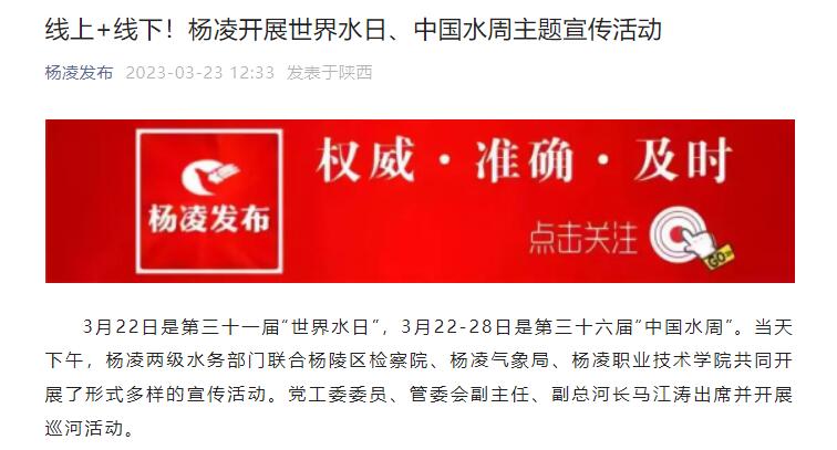 3月22日是第三十一届“世界水日”,3月22-28日是第三十六届“中国水周”。当天下午,杨凌两级水务部门联合杨陵区检察院、杨凌气象局、350vip浦京集团官网共同开展了形式多样的宣传活动。党工委委员、管委会副主任、副总河长马江涛出席并开展巡河活动。