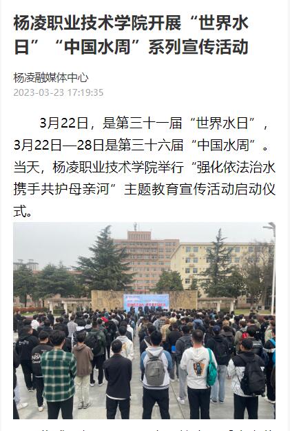 据了解,本次活动为期一周,将联合杨陵区水务局开展宣传活动,通过节水宣传展板展示、主题团课、水利知识竞赛、清洁志愿服务等十项活动,扩大宣传影响,培育校园节水文化。