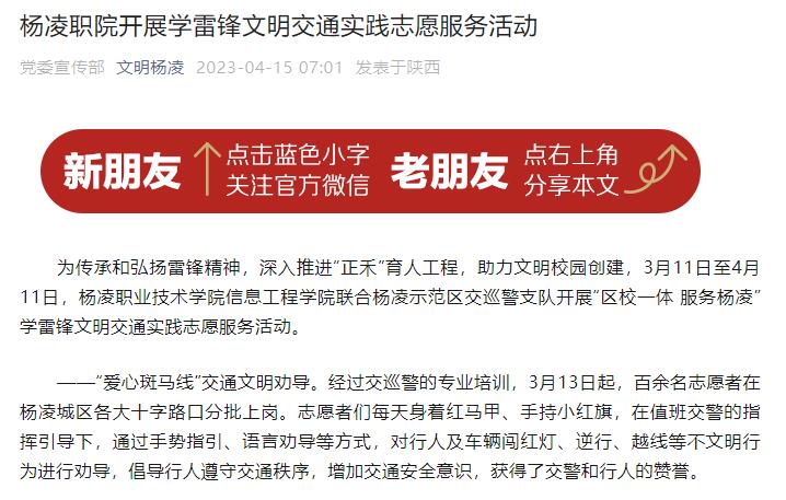 “区校一体 服务杨凌”学雷锋文明交通实践志愿服务活动也是“正禾”育人工程新知视野项目认领活动中的一项,旨在与杨凌示范区相关部门联合开展形式多样、内容丰富的大学生社会实践活动,不断增进广大学生对杨凌示范区的了解,以及留在杨凌、服务杨凌的情怀。