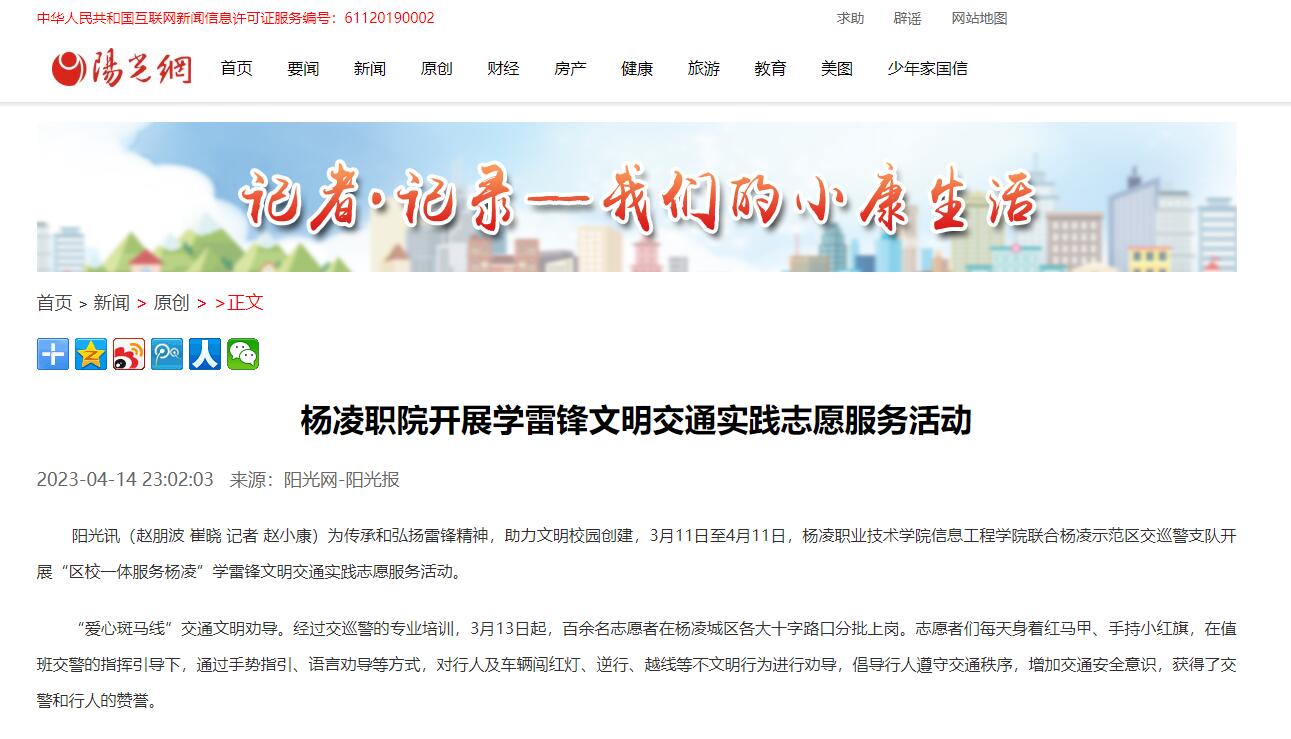 阳光讯(赵朋波 崔晓 记者 赵小康)为传承和弘扬雷锋精神,助力文明校园创建,3月11日至4月11日,350vip浦京集团官网信息工程学院联合杨凌示范区交巡警支队开展“区校一体服务杨凌”学雷锋文明交通实践志愿服务活动。