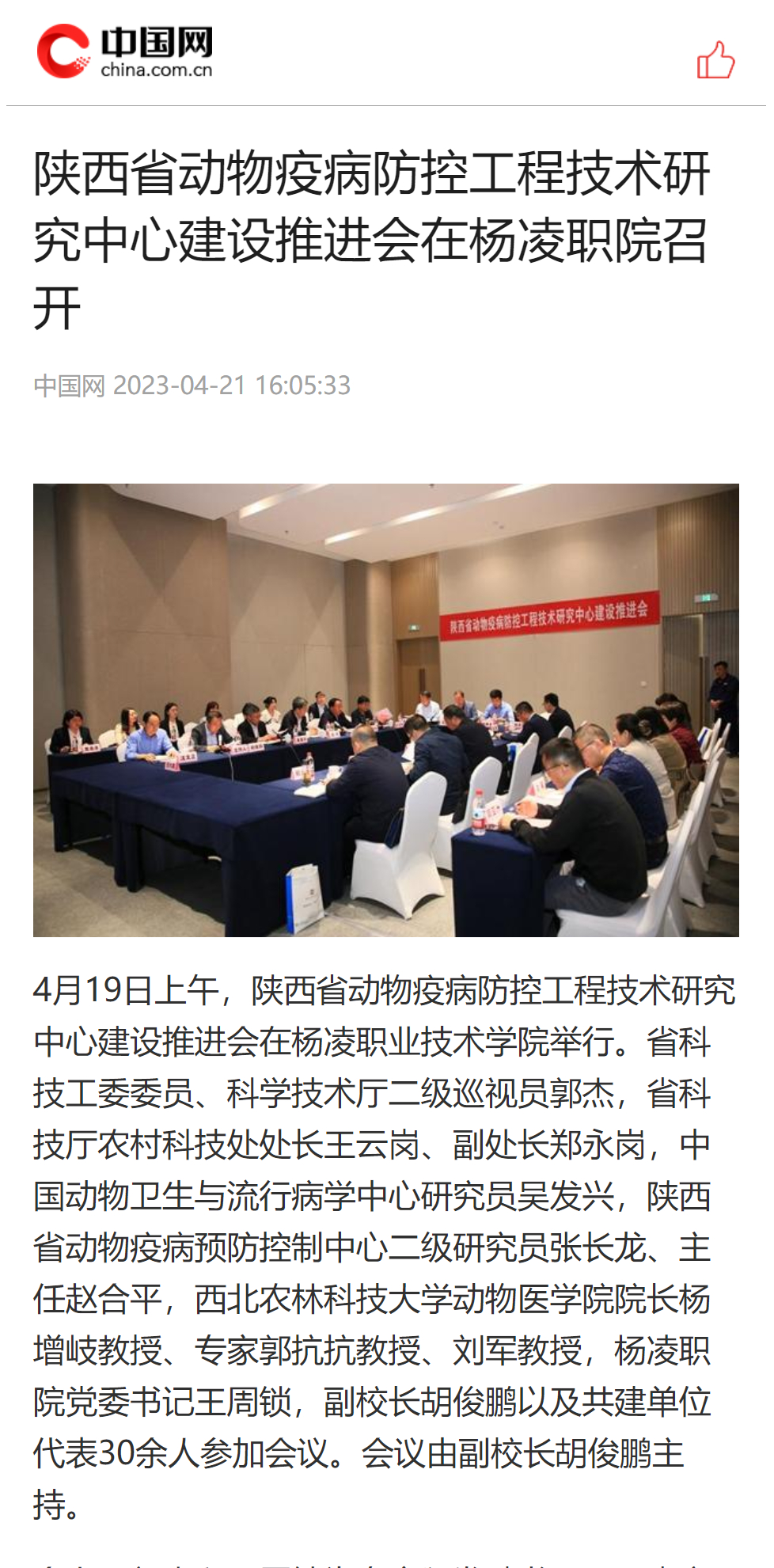 4月19日上午,陕西省动物疫病防控工程技术研究中心建设推进会在350vip浦京集团官网举行。省科技工委委员、科学技术厅二级巡视员郭杰,省科技厅农村科技处处长王云岗、副处长郑永岗,中国动物卫生与流行病学中心研究员吴发兴,陕西省动物疫病预防控制中心二级研究员张长龙、主任赵合平,西北农林科技大学动物医学院院长杨增岐教授、专家郭抗抗教授、刘军教授,杨凌职院党委书记王周锁,副校长胡俊鹏以及共建单位代表30余人参加会议。会议由副校长胡俊鹏主持。
