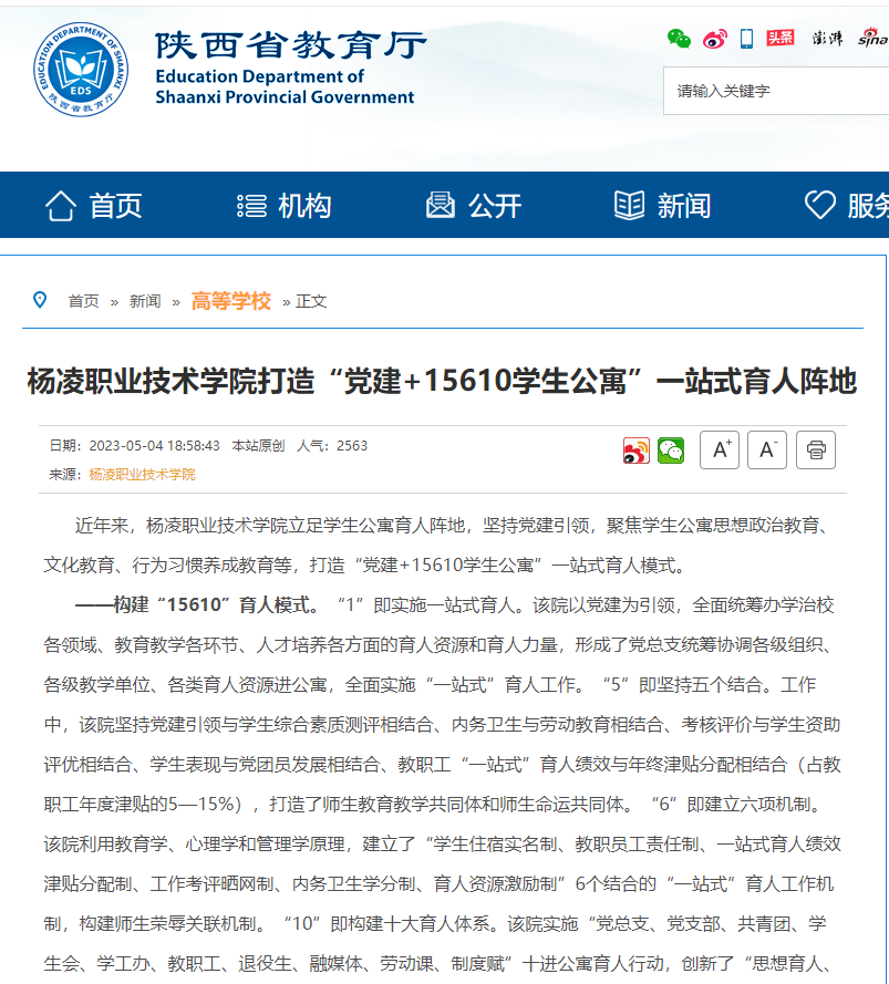 ——打造“一校多品”校园文化教育品牌。该院通过持续发力,久久为功,形成了可复制、可示范、可推广的《“党建+15610公寓育人”“一站式”育人工作实施方案》。以学生公寓为载体,以“一站式”育人模式为抓手,大力实施以“红船精神、延安精神、建党精神”等为主要内容的中华民族精神谱系教育,以“四维、五常、八德、五美、五伦”为主要内容的中华传统美德文化教育,以“24节气”为主要内容的农耕文化教育等,成效显著,打造了“一校多品”的特色校园文化教育品牌。近日,该院创新实施的《“中华优秀美德文化”教育工程》获全国职业教育中华传统美德教育优秀成果建设培育项目“优秀案例奖”、《“24节气暨农耕文化”教育工程》获全国职业教育中华传统美德教育优秀成果建设培育项目“典型案例奖”、《中华传统美德文化卧谈30篇》获全国职业教育中华传统美德教育优秀成果建设培育项目“优秀成果奖”、《高职院校中华传统美德文化的实践研究》获“全国职业院校校园文化建设示范成果奖”、《“党建+学生公寓”三全育人工程》获评“陕西省学生工作精品项目”。