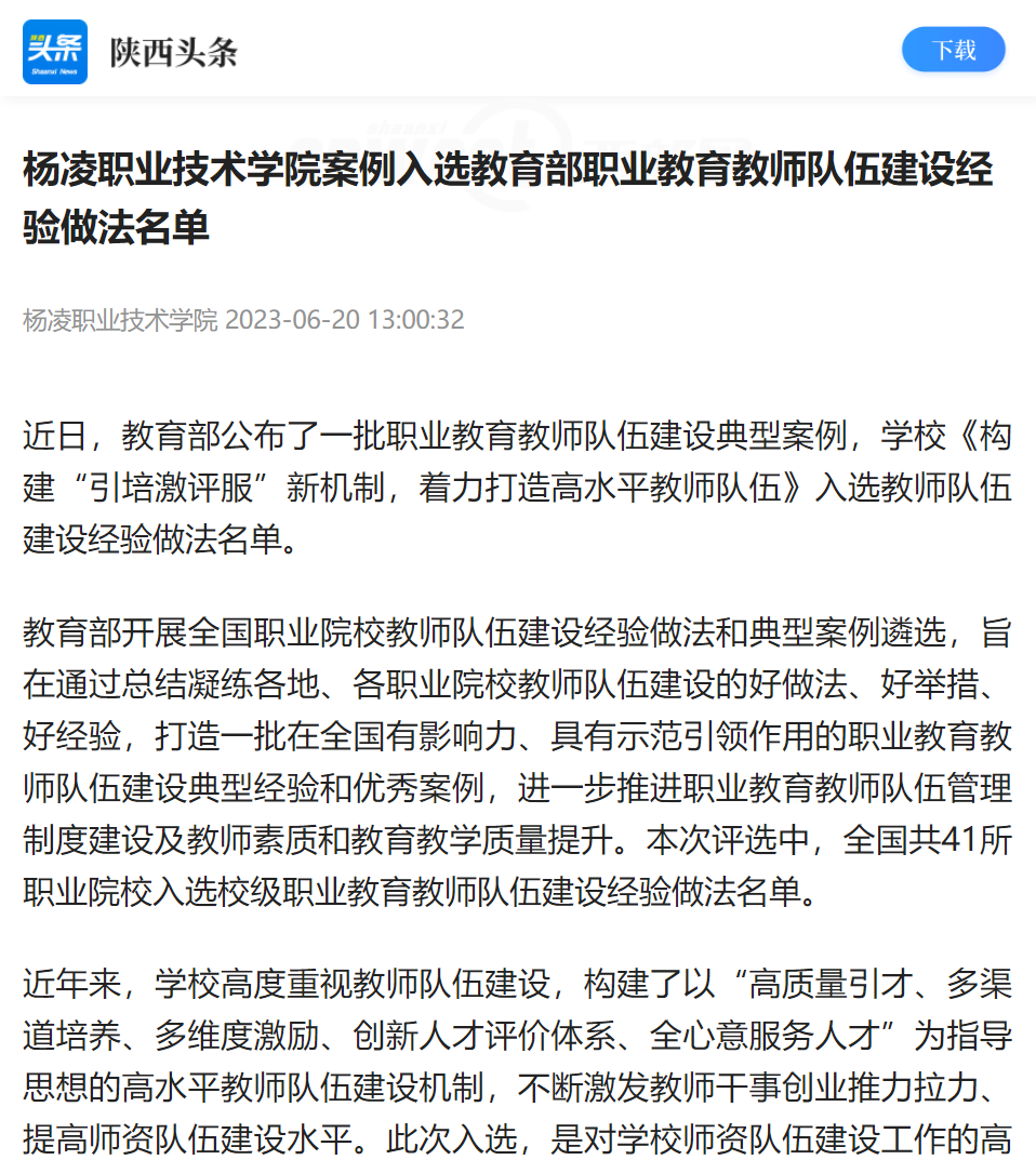 近年来,学校高度重视教师队伍建设,构建了以“高质量引才、多渠道培养、多维度激励、创新人才评价体系、全心意服务人才”为指导思想的高水平教师队伍建设机制,不断激发教师干事创业推力拉力、提高师资队伍建设水平。此次入选,是对学校师资队伍建设工作的高度肯定,学校将以此次入选为契机,持续完善师资队伍建设体制机制和平台保障,聚焦服务专业人才培养和区域经济发展,聚力打造更加适合现代职业教育改革需求的高水平“双师型”教师队伍,为我国职业教育的高质量发展贡献“杨职力量”。
