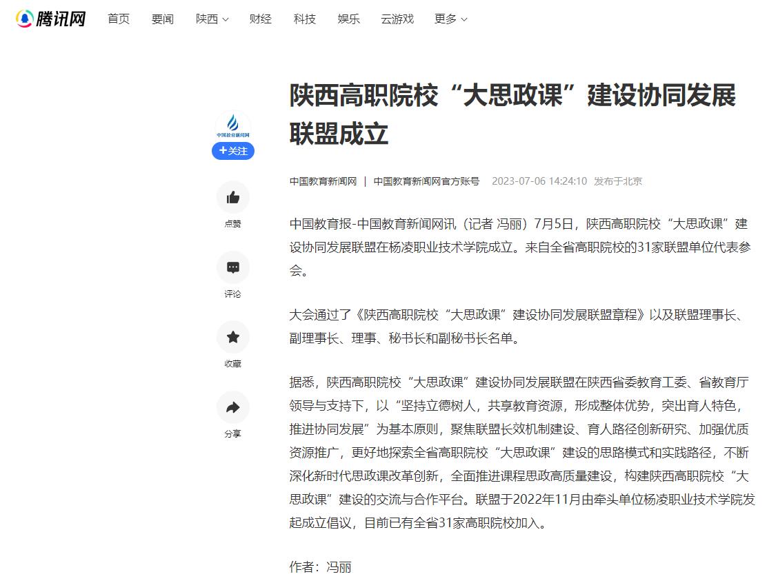 中国教育报-中国教育新闻网讯(记者 冯丽)7月5日,陕西高职院校“大思政课”建设协同发展联盟在350vip浦京集团官网成立。来自全省高职院校的31家联盟单位代表参会。