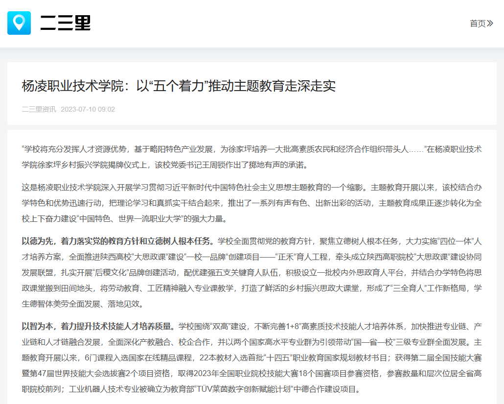 以德为先,着力落实党的教育方针和立德树人根本任务。学校全面贯彻党的教育方针,聚焦立德树人根本任务,大力实施“四位一体”人才培养方案,全面推进陕西高校“大思政课”建设“一校一品牌”创建项目——“正禾”育人工程,牵头成立陕西高职院校“大思政课”建设协同发展联盟,扎实开展“后稷文化”品牌创建活动,配优建强五支关键育人队伍,积极设立一批校内外思政育人平台,并结合办学特色将思政课堂搬到田间地头,将劳动教育、工匠精神融入专业课教学,打造了鲜活的乡村振兴思政大课堂,形成了“三全育人”工作新格局,学生德智体美劳全面发展、落地见效。