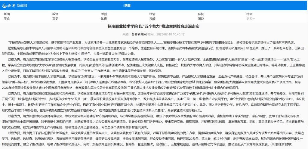 以察为力,着力加强对职业教育调查研究。学校对照党中央明确的12方面调研内容,与办学治校实际紧密结合,确定了事关学校改革发展的10方面调研内容,由校领导班子牵头“领题”、带队“破题”,处级干部结合岗位职责、坚持问题导向全面开展调研。对于调研中发现的问题,主题教育领导小组办公室形成问题清单,并转交相关部门进行承办,要求立行立改、限期答复,并明确目标和时限,拿出整改方案。同时,立足涉农办学特色,将主题教育与现代农业发展、助力乡村振兴等工作有机衔接,校领导班子成员赴杨陵区、旬邑县多个镇村开展乡村振兴调研。