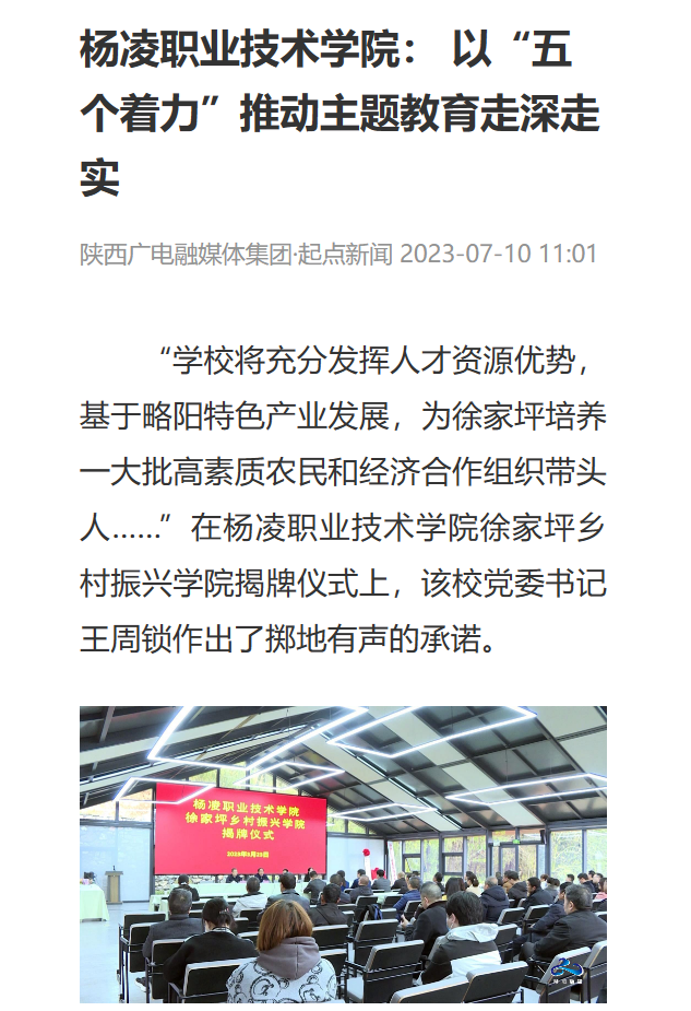 以需为纲,着力服务国家区域发展战略和对外开放。学校围绕推动脱贫攻坚与乡村振兴有效衔接,连续三年开展“百名专家进百村”“万名学子进万村”乡村振兴大调研和“乡村振兴大课堂”文明实践活动,并与杨陵区、彬州市分别开展“五联一抓”推进乡村振兴计划、乡村振兴校地合作“五共一建”,获全国职业院校乡村振兴优秀案例1个。致力科技成果转化推广,搭建“三果一菌一蜂”特色产业发展平台,建立陕西职业教育乡村振兴研究院等“2院7中心”,成立院士、博士+高职生、教授+科研推广工作室和企业(产业)学院,构建了农业职业院校“产学研用”新业态,林麝产业研发中心获批省级工程技术研究中心。此外,深入推进开放办学,在几内亚、乌兹别克斯坦分别成立水利工程学院、现代农业学院2个海外分校,在哈萨克斯坦建立“现代农业技术培训中心”,在乌兹别克斯坦建立“现代农业技术创新示范基地”,开展农业技术指导和示范。