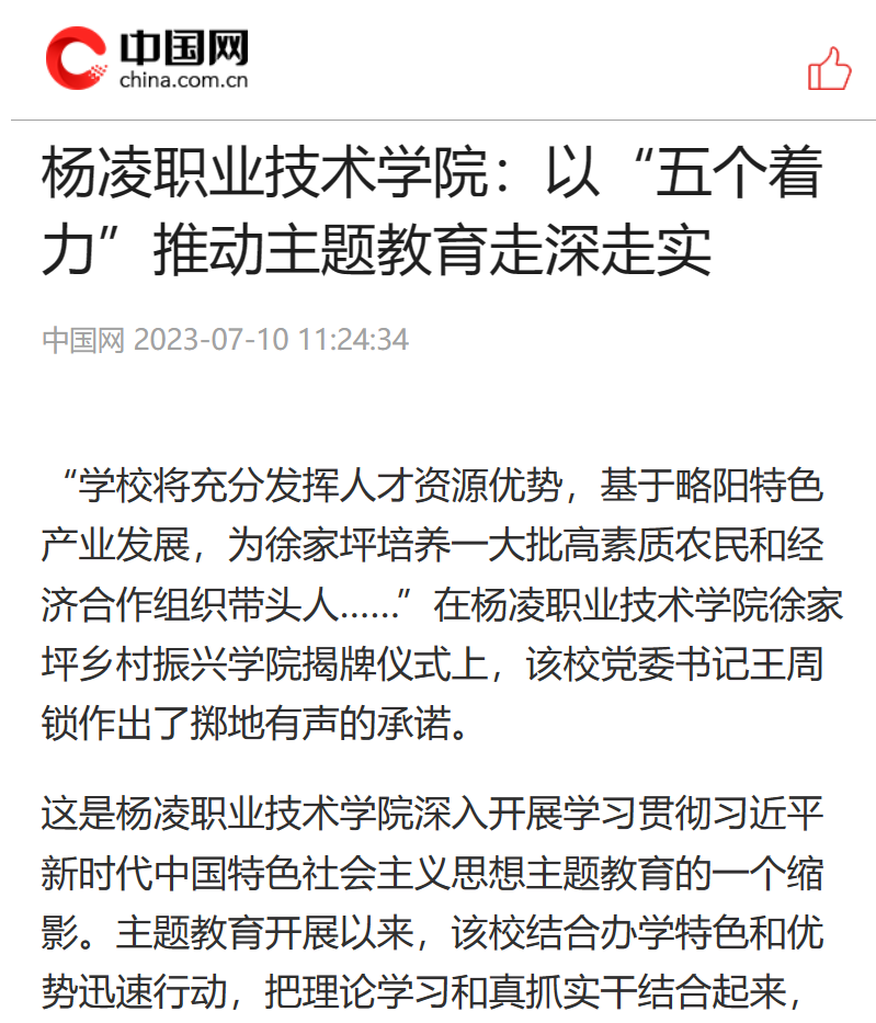 以德为先,着力落实党的教育方针和立德树人根本任务。学校全面贯彻党的教育方针,聚焦立德树人根本任务,大力实施“四位一体”人才培养方案,全面推进陕西高校“大思政课”建设“一校一品牌”创建项目——“正禾”育人工程,牵头成立陕西高职院校“大思政课”建设协同发展联盟,扎实开展“后稷文化”品牌创建活动,配优建强五支关键育人队伍,积极设立一批校内外思政育人平台,并结合办学特色将思政课堂搬到田间地头,将劳动教育、工匠精神融入专业课教学,打造了鲜活的乡村振兴思政大课堂,形成了“三全育人”工作新格局,学生德智体美劳全面发展、落地见效。