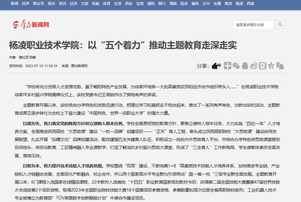以德为先,着力落实党的教育方针和立德树人根本任务。学校全面贯彻党的教育方针,聚焦立德树人根本任务,大力实施“四位一体”人才培养方案,全面推进陕西高校“大思政课”建设“一校一品牌”创建项目——“正禾”育人工程,牵头成立陕西高职院校“大思政课”建设协同发展联盟,扎实开展“后稷文化”品牌创建活动,配优建强五支关键育人队伍,积极设立一批校内外思政育人平台,并结合办学特色将思政课堂搬到田间地头,将劳动教育、工匠精神融入专业课教学,打造了鲜活的乡村振兴思政大课堂,形成了“三全育人”工作新格局,学生德智体美劳全面发展、落地见效。