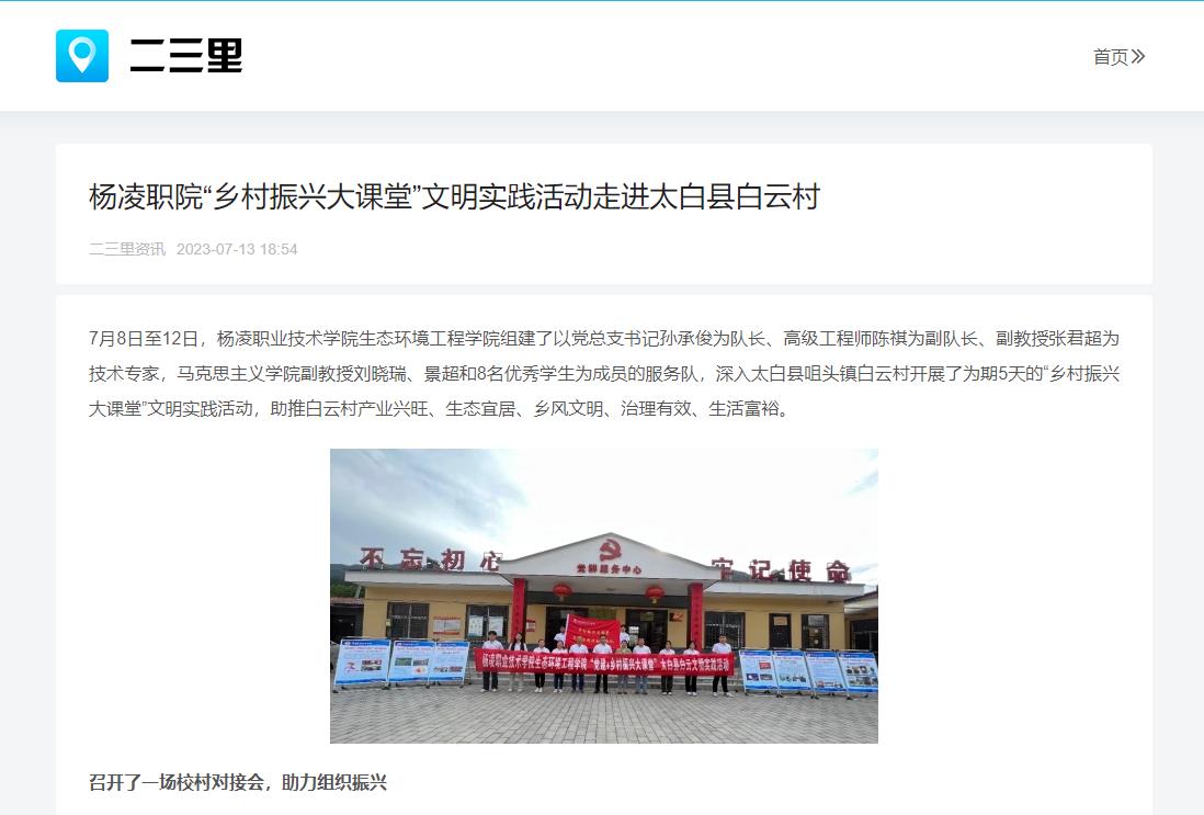 7月8日至12日,350vip浦京集团官网生态环境工程学院组建了以党总支书记孙承俊为队长、高级工程师陈祺为副队长、副教授张君超为技术专家,马克思主义学院副教授刘晓瑞、景超和8名优秀学生为成员的服务队,深入太白县咀头镇白云村开展了为期5天的“乡村振兴大课堂”文明实践活动,助推白云村产业兴旺、生态宜居、乡风文明、治理有效、生活富裕。