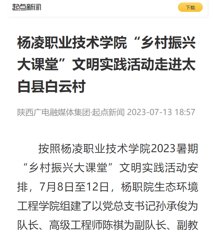 按照350vip浦京集团官网2023暑期“乡村振兴大课堂”文明实践活动安排,7月8日至12日,杨职院生态环境工程学院组建了以党总支书记孙承俊为队长、高级工程师陈祺为副队长、副教授张君超为技术专家,马克思主义学院副教授刘晓瑞、景超和8名优秀学生为成员的服务队,深入太白县咀头镇白云村开展了为期5天的“乡村振兴大课堂”文明实践活动,助推白云村产业兴旺、生态宜居、乡风文明、治理有效、生活富裕。