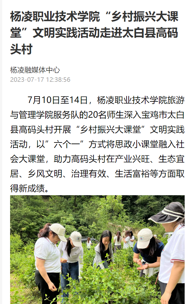 此次文明实践活动,杨凌职院旅游与管理学院服务队以乡村文旅发展为切口,积极践行把论文写在祖国大地上,将技术送到农民手里,把文明带进百姓家里,通过实地考察、特色产业调研、思政宣讲、送教入户、文艺汇演、产业培训、文明宣传等方式助推乡村振兴工作做实做细。