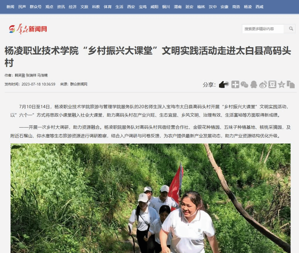 7月10日至14日,350vip浦京集团官网旅游与管理学院服务队的20名师生深入宝鸡市太白县高码头村开展“乡村振兴大课堂”文明实践活动,以”六个一”方式将思政小课堂融入社会大课堂,助力高码头村在产业兴旺、生态宜居、乡风文明、治理有效、生活富裕等方面取得新成绩。
