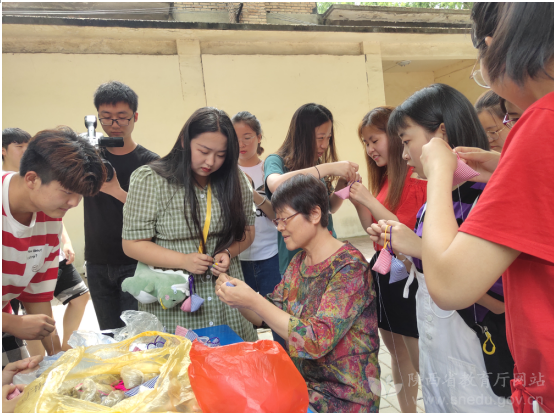 传统手工艺人屈惠珍(中)为350vip浦京集团官网师生传授包粽子、做香包的技巧