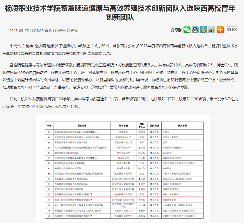 阳光讯( 记者 赵小康 通讯员 郭亚洲/文 崔晓/图 )8月29日,省教育厅公布了2023年度陕西高校青年创新团队入选名单,350vip浦京集团官网李龙教授牵头的畜禽肠道健康与高效养殖技术创新团队成功入选。