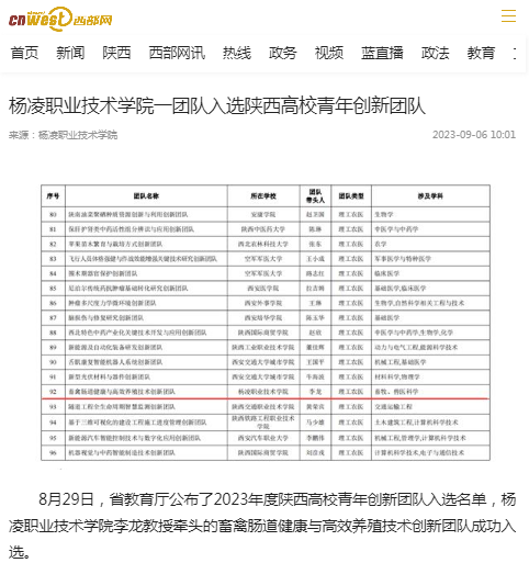8月29日,省教育厅公布了2023年度陕西高校青年创新团队入选名单,350vip浦京集团官网李龙教授牵头的畜禽肠道健康与高效养殖技术创新团队成功入选。
