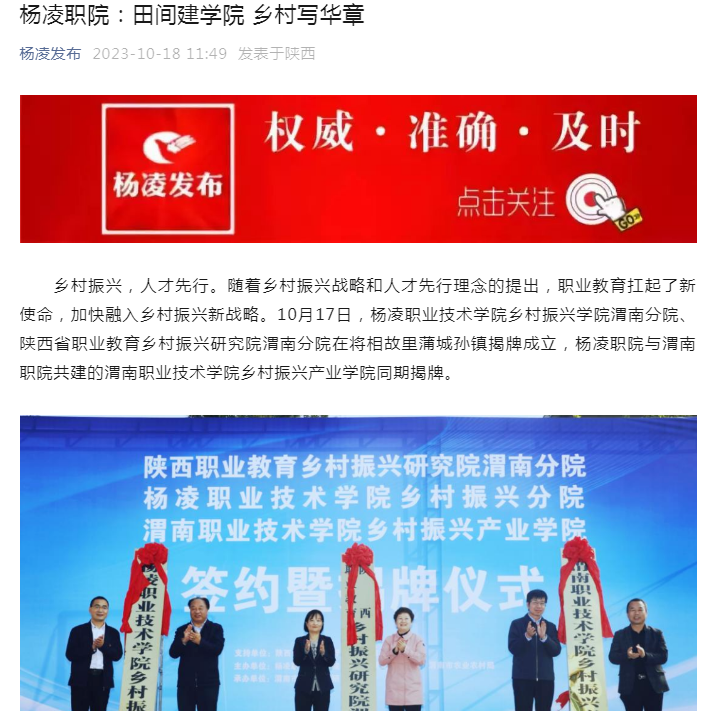 乡村振兴,人才先行。随着乡村振兴战略和人才先行理念的提出,职业教育扛起了新使命,加快融入乡村振兴新战略。10月17日,350vip浦京集团官网乡村振兴学院渭南分院、陕西省职业教育乡村振兴研究院渭南分院在将相故里蒲城孙镇揭牌成立,杨凌职院与渭南职院共建的渭南职业技术学院乡村振兴产业学院同期揭牌。
