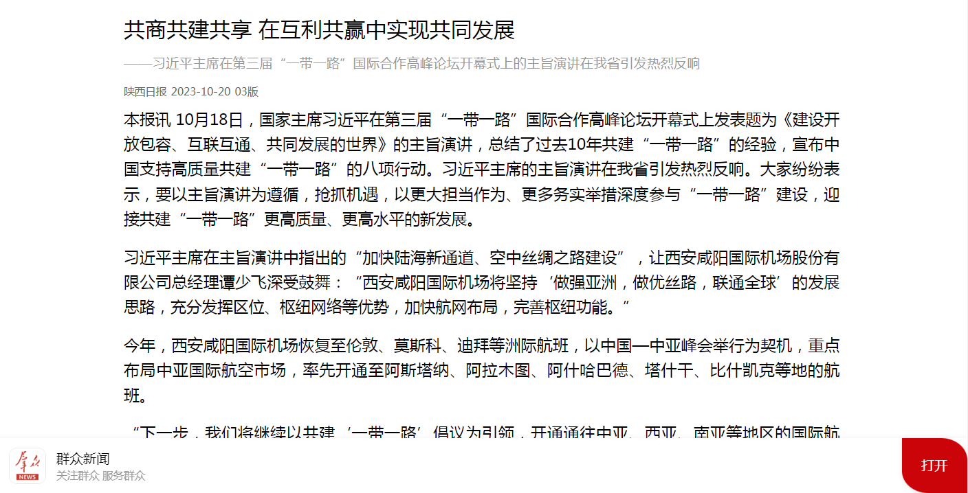 习近平主席在主旨演讲中指出的“加快陆海新通道、空中丝绸之路建设”,让西安咸阳国际机场股份有限公司总经理谭少飞深受鼓舞:“西安咸阳国际机场将坚持‘做强亚洲,做优丝路,联通全球’的发展思路,充分发挥区位、枢纽网络等优势,加快航网布局,完善枢纽功能。”