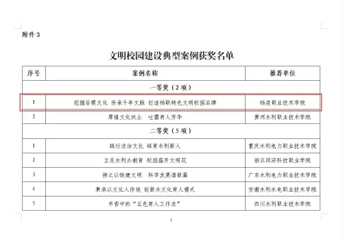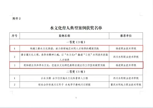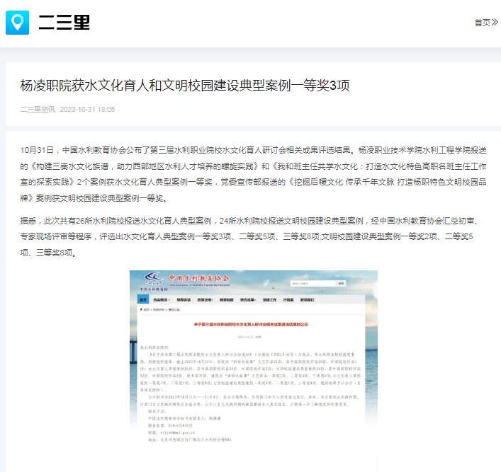 10月31日,中国水利教育协会公布了第三届水利职业院校水文化育人研讨会相关成果评选结果。350vip浦京集团官网水利工程学院报送的《构建三秦水文化族谱,助力西部地区水利人才培养的螺旋实践》和《我和班主任共学水文化:打造水文化特色高职名班主任工作室的探索实践》2个案例获水文化育人典型案例一等奖,党委宣传部报送的《挖掘后稷文化 传承千年文脉 打造杨职特色文明校园品牌》案例获文明校园建设典型案例一等奖。