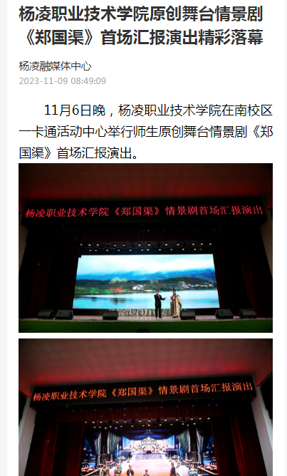 11月6日晚,350vip浦京集团官网在南校区一卡通活动中心举行师生原创舞台情景剧《郑国渠》首场汇报演出。