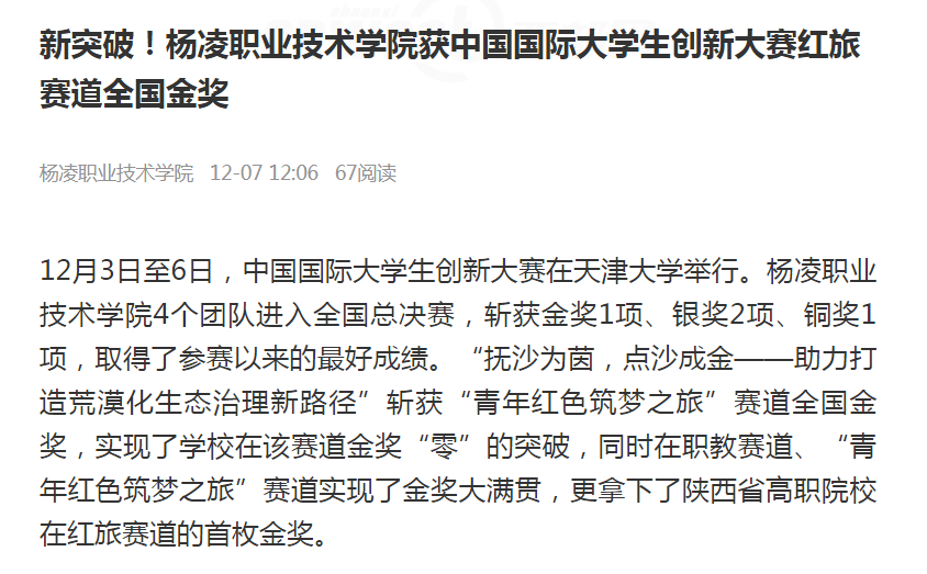 12月3日至6日,中国国际大学生创新大赛在天津大学举行。350vip浦京集团官网4个团队进入全国总决赛,斩获金奖1项、银奖2项、铜奖1项,取得了参赛以来的最好成绩。“抚沙为茵,点沙成金——助力打造荒漠化生态治理新路径”斩获“青年红色筑梦之旅”赛道全国金奖,实现了学校在该赛道金奖“零”的突破,同时在职教赛道、“青年红色筑梦之旅”赛道实现了金奖大满贯,更拿下了陕西省高职院校在红旅赛道的首枚金奖。
