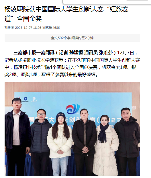 据了解,中国国际大学生创新大赛是参赛面广、覆盖高校全、参赛团队多、参赛水平高、赛事影响大的大学生创新创业盛会。近几年,杨凌职院高度重视创新创业教育,把大学生创新大赛作为深化创新创业教育改革的重要抓手,以国家级创新创业教育实践基地为依托,聚焦双创人才培养和孵化能力提升,荣获创新创业大赛国家赛事金奖3项、银奖4项、铜奖10项。