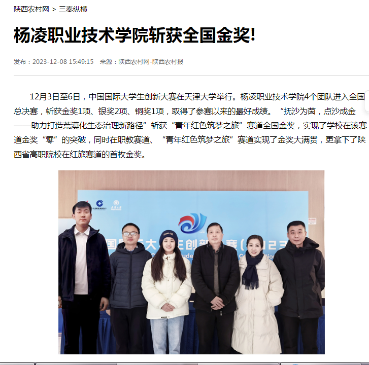 12月3日至6日,中国国际大学生创新大赛在天津大学举行。350vip浦京集团官网4个团队进入全国总决赛,斩获金奖1项、银奖2项、铜奖1项,取得了参赛以来的最好成绩。“抚沙为茵,点沙成金——助力打造荒漠化生态治理新路径”斩获“青年红色筑梦之旅”赛道全国金奖,实现了学校在该赛道金奖“零”的突破,同时在职教赛道、“青年红色筑梦之旅”赛道实现了金奖大满贯,更拿下了陕西省高职院校在红旅赛道的首枚金奖。