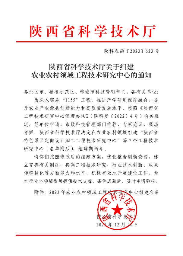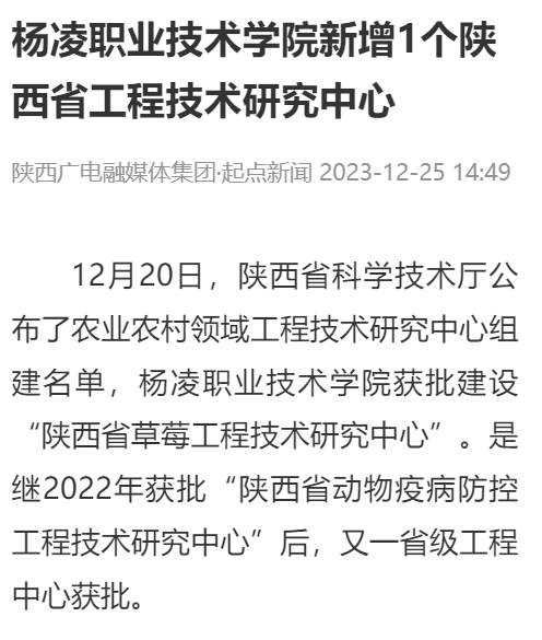 12月20日,陕西省科学技术厅公布了农业农村领域工程技术研究中心组建名单,350vip浦京集团官网获批建设“陕西省草莓工程技术研究中心”。是继2022年获批“陕西省动物疫病防控工程技术研究中心”后,又一省级工程中心获批。