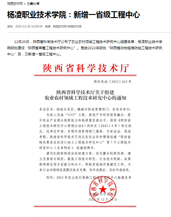 12月20日,陕西省科学技术厅公布了农业农村领域工程技术研究中心组建名单,350vip浦京集团官网获批建设“陕西省草莓工程技术研究中心”。是继2022年获批“陕西省动物疫病防控工程技术研究中心”后,又新增一省级工程中心。