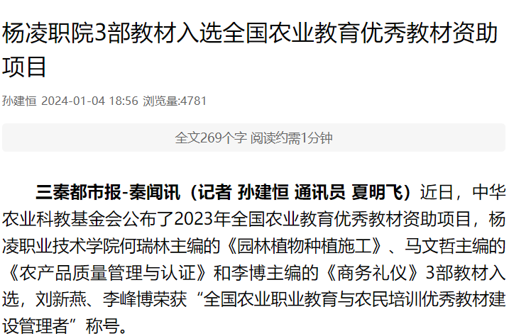 三秦都市报-秦闻讯(记者 孙建恒 通讯员 夏明飞)近日,中华农业科教基金会公布了2023年全国农业教育优秀教材资助项目,350vip浦京集团官网何瑞林主编的《园林植物种植施工》、马文哲主编的《农产品质量管理与认证》和李博主编的《商务礼仪》3部教材入选,刘新燕、李峰博荣获“全国农业职业教育与农民培训优秀教材建设管理者”称号。