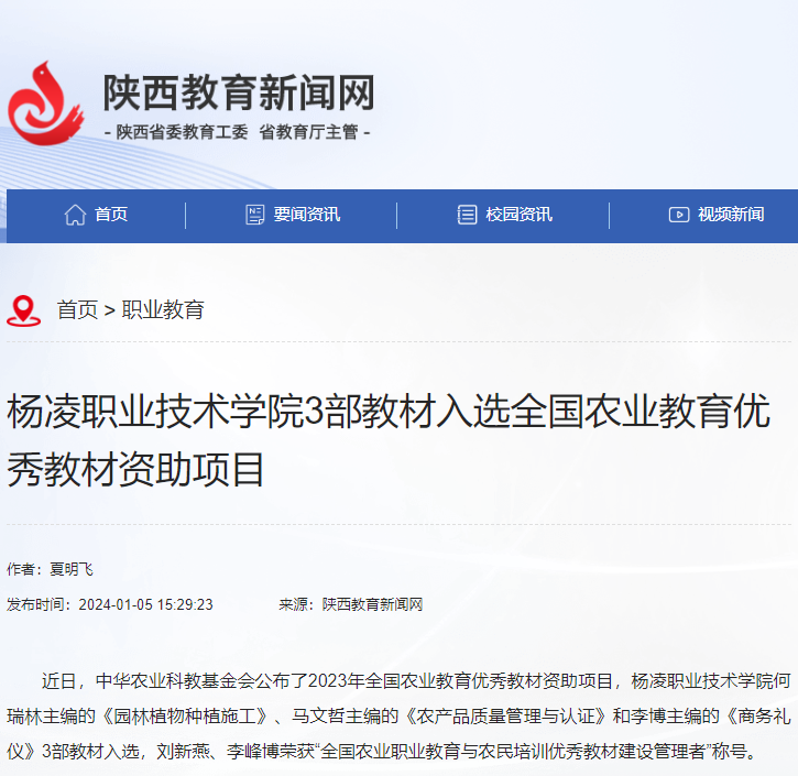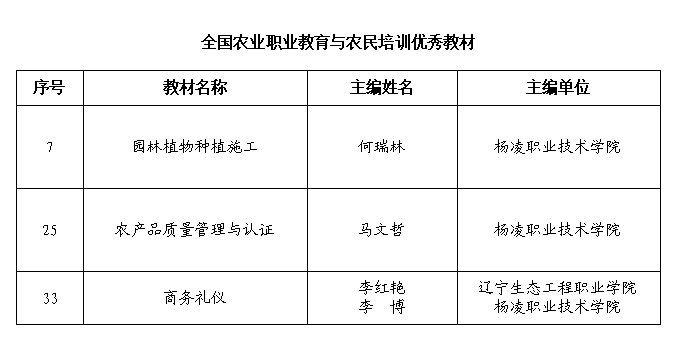 近日,中华农业科教基金会公布了2023年全国农业教育优秀教材资助项目,350vip浦京集团官网何瑞林主编的《园林植物种植施工》、马文哲主编的《农产品质量管理与认证》和李博主编的《商务礼仪》3部教材入选,刘新燕、李峰博荣获“全国农业职业教育与农民培训优秀教材建设管理者”称号。