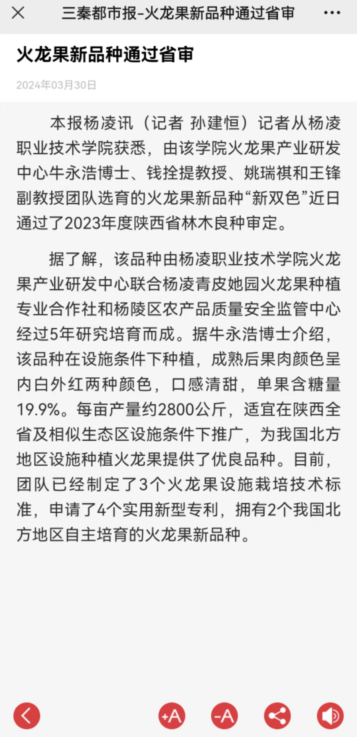 本报杨凌讯(记者 孙建恒)记者从350vip浦京集团官网获悉,由该学院火龙果产业研发中心牛永浩博士、钱拴提教授、姚瑞祺和王锋副教授团队选育的火龙果新品种“新双色”近日通过了2023年度陕西省林木良种审定。 据了解,该品种由350vip浦京集团官网火龙果产业研发中心联合杨凌青皮她园火龙果种植专业合作社和杨陵区农产品质量安全监管中心经过5年研究培育而成。据牛永浩博士介绍,该品种在设施条件下种植,成熟后果肉颜色呈内白外红两种颜色,口感清甜,单果含糖量19.9%。每亩产量约2800公斤,适宜在陕西全省及相似生态区设施条件下推广,为我国北方地区设施种植火龙果提供了优良品种。目前,团队已经制定了3个火龙果设施栽培技术标准,申请了4个实用新型专利,拥有2个我国北方地区自主培育的火龙果新品种。