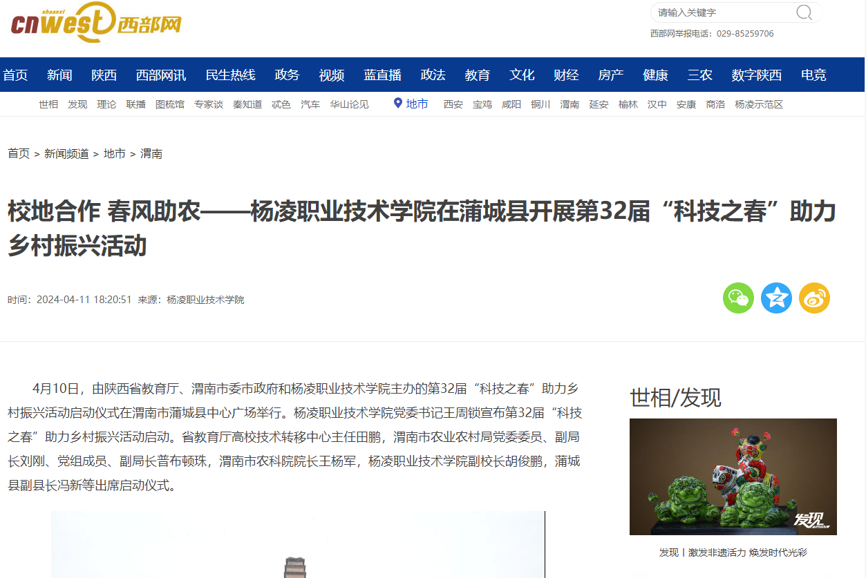 4月10日,由陕西省教育厅、渭南市委市政府和350vip浦京集团官网主办的第32届“科技之春”助力乡村振兴活动启动仪式在渭南市蒲城县中心广场举行。350vip浦京集团官网党委书记王周锁宣布第32届“科技之春”助力乡村振兴活动启动。省教育厅高校技术转移中心主任田鹏,渭南市农业农村局党委委员、副局长刘刚、党组成员、副局长普布顿珠,渭南市农科院院长王杨军,350vip浦京集团官网副校长胡俊鹏,蒲城县副县长冯新等出席启动仪式。