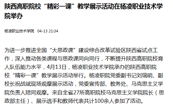 为进一步推进全国“大思政课”建设综合改革试验区陕西省试点工作,深入推动各类课程与思政课同向同行,不断提升陕西高职院校育人队伍能力水平,4月13日,350vip浦京集团官网承办的陕西高职院校“精彩一课”教学展示活动举行。杨凌职院党委副书记刘瑞明、副校长祝战斌现场观摩展示活动,党委宣传部、教务处、马克思主义学院负责人陪同观摩。来自全省27所高职院校马克思主义学院院长(思政部主任)、展示选手和教师代表共计100余人参加了活动。