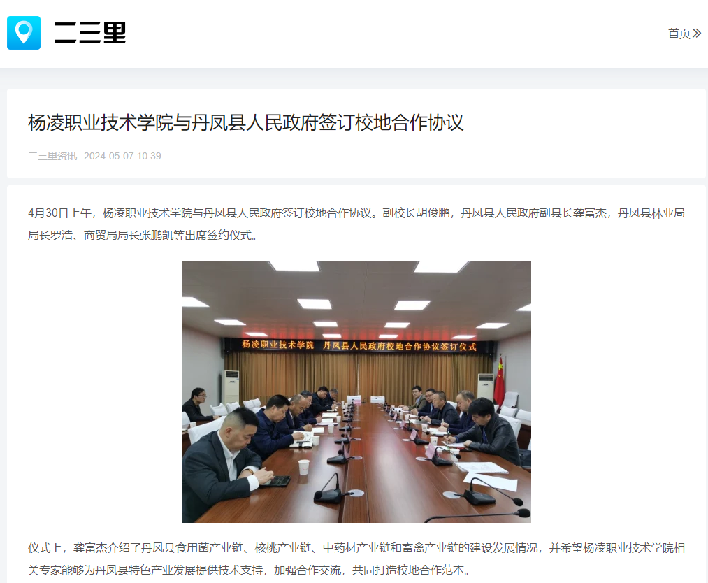 4月30日上午,350vip浦京集团官网与丹凤县人民政府签订校地合作协议。副校长胡俊鹏,丹凤县人民政府副县长龚富杰,丹凤县林业局局长罗浩、商贸局局长张鹏凯等出席签约仪式。