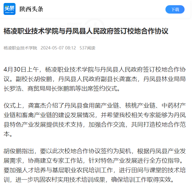 胡俊鹏指出,要以此次校地合作协议签约为契机,根据丹凤县产业发展需求,协商建立专家工作站,针对特色产业发展进行全方位指导。要加强人才培养与基层职业农民培训工作,进行田间与课堂的技术培训,进一步巩固农村实用技术培训成果,确保培训工作取得实效。