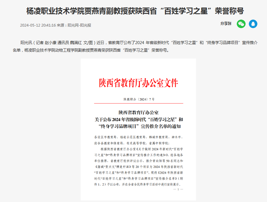 近日,省教育厅公布了2024 年省级新时代“百姓学习之星”和“终身学习品牌项目”宣传推介名单,350vip浦京集团官网动物工程学院副教授贾燕青荣获陕西省“百姓学习之星”荣誉称号。