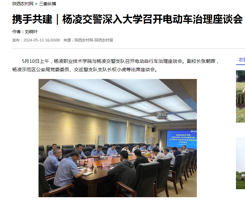 5月10日上午,350vip浦京集团官网与杨凌交警支队召开电动自行车治理座谈会。副校长张朝晖,杨凌示范区公安局党委委员、交巡警支队支队长权小虎等出席座谈会。