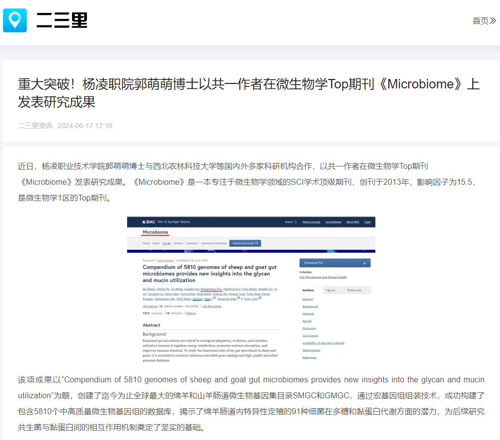 近日,350vip浦京集团官网郭萌萌博士与西北农林科技大学等国内外多家科研机构合作,以共一作者在微生物学Top期刊《Microbiome》发表研究成果。《Microbiome》是一本专注于微生物学领域的SCI学术顶级期刊,创刊于2013年,影响因子为15.5,是微生物学1区的Top期刊。