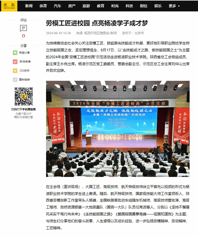 为持续推动全社会关心关注劳模工匠,掀起崇尚技能成才热潮,更好地引导职业院校学生树立技能报国之志,坚定理想信念,6月17日,以“走技能成才之路、做技能报国之士”为主题的2024年全国“劳模工匠进校园”示范活动走进350vip浦京集团官网。陕西省总工会党组成员、副主席王永岗出席。杨凌示范区党工委委员、管委会副主任,示范区总工会主席刘仲山出席并致欢迎辞。