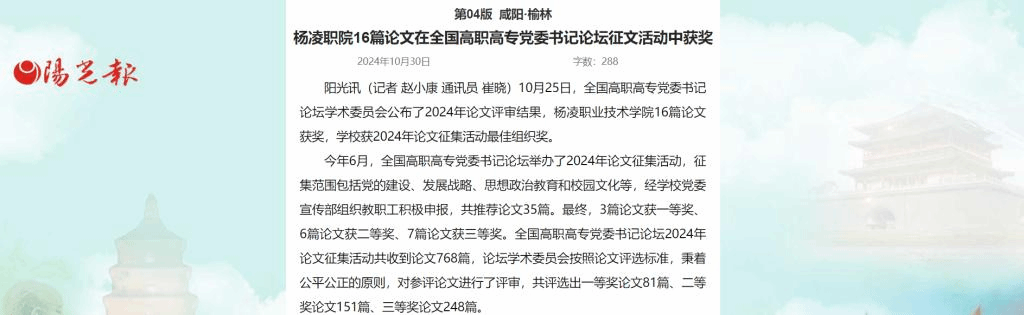 阳光讯(记者 赵小康 通讯员 崔晓)10月25日,全国高职高专党委书记论坛学术委员会公布了2024年论文评审结果,350vip浦京集团官网16篇论文获奖,学校获2024年论文征集活动最佳组织奖。