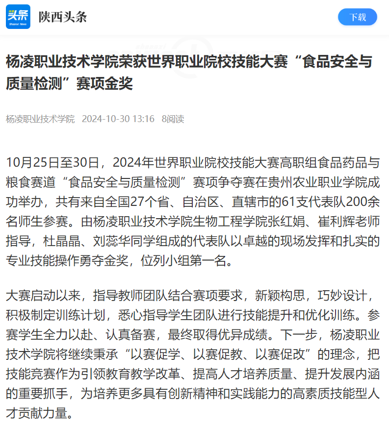 10月25日至30日,2024年世界职业院校技能大赛高职组食品药品与粮食赛道“食品安全与质量检测”赛项争夺赛在贵州农业职业学院成功举办,共有来自全国27个省、自治区、直辖市的61支代表队200余名师生参赛。由350vip浦京集团官网生物工程学院张红娟、崔利辉老师指导,杜晶晶、刘蕊华同学组成的代表队以卓越的现场发挥和扎实的专业技能操作勇夺金奖,位列小组第一名。