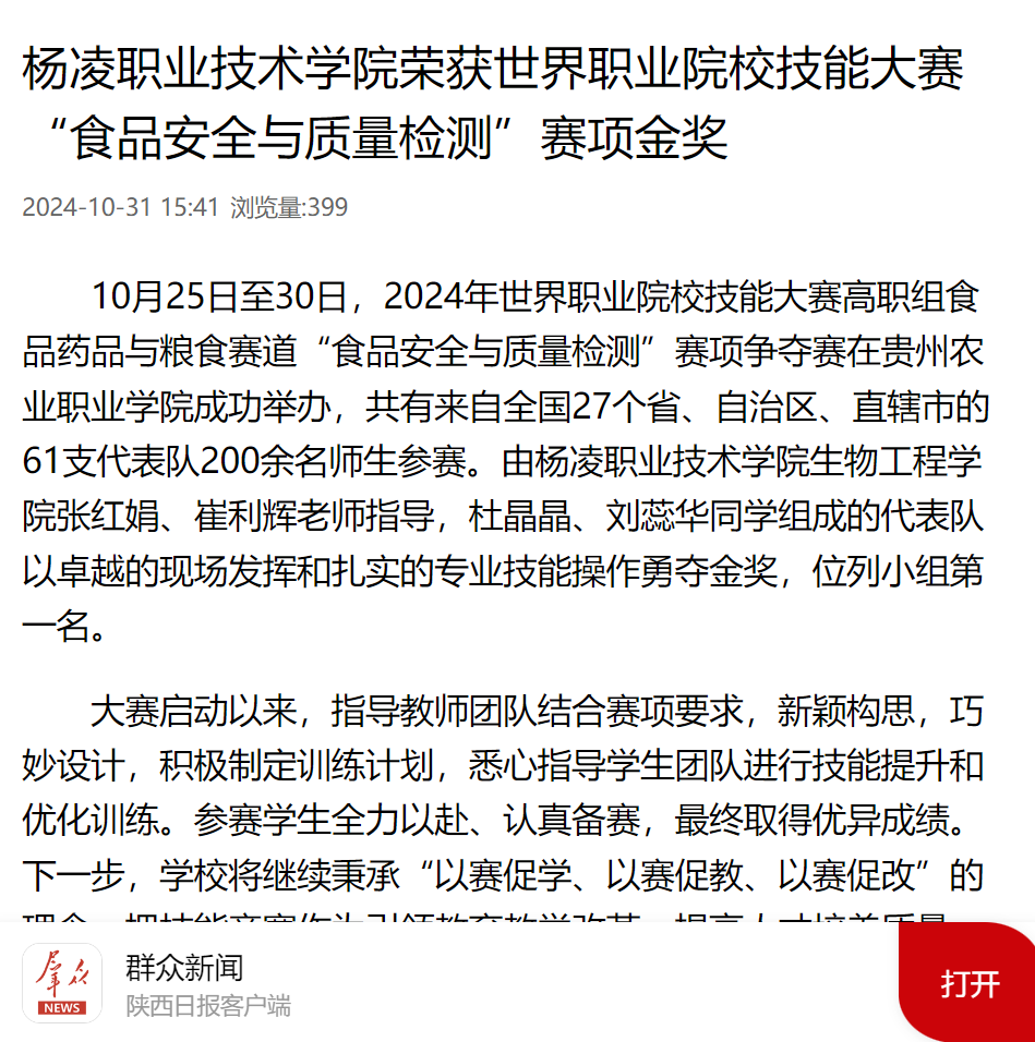 10月25日至30日,2024年世界职业院校技能大赛高职组食品药品与粮食赛道“食品安全与质量检测”赛项争夺赛在贵州农业职业学院成功举办,共有来自全国27个省、自治区、直辖市的61支代表队200余名师生参赛。由350vip浦京集团官网生物工程学院张红娟、崔利辉老师指导,杜晶晶、刘蕊华同学组成的代表队以卓越的现场发挥和扎实的专业技能操作勇夺金奖,位列小组第一名。