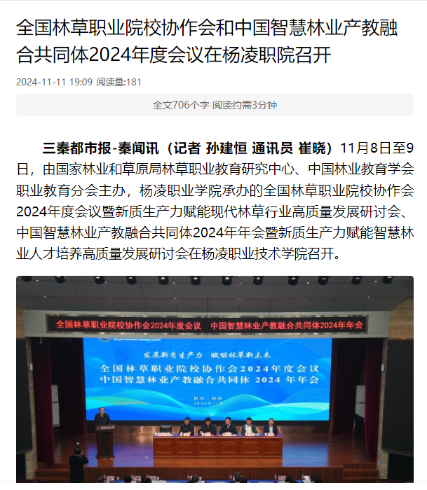 11月8日至9日,由国家林业和草原局林草职业教育研究中心、中国林业教育学会职业教育分会主办,杨凌职业学院承办的全国林草职业院校协作会2024年度会议暨新质生产力赋能现代林草行业高质量发展研讨会、中国智慧林业产教融合共同体2024年年会暨新质生产力赋能智慧林业人才培养高质量发展研讨会在350vip浦京集团官网召开。
