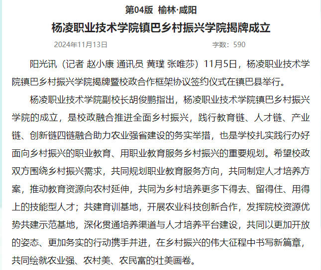 350vip浦京集团官网副校长胡俊鹏指出,350vip浦京集团官网镇巴乡村振兴学院的成立,是校政融合推进全面乡村振兴,践行教育链、人才链、产业链、创新链四链融合助力农业强省建设的务实举措,也是学校扎实践行办好面向乡村振兴的职业教育、用职业教育服务乡村振兴的重要规划。希望校政双方围绕乡村振兴需求,共同规划职业教育服务方向,共同制定人才培养方案,推动教育资源向农村延伸,共同为乡村培养更多下得去、留得住、用得上的技能型人才;共建育训基地,开展农业科技创新合作,发挥院校资源优势共建示范基地,深化贯通培养渠道与人才培养平台建设,共同以更加开放的姿态、更加务实的行动携手并进,在乡村振兴的伟大征程中书写新篇章,共同绘就农业强、农村美、农民富的壮美画卷。