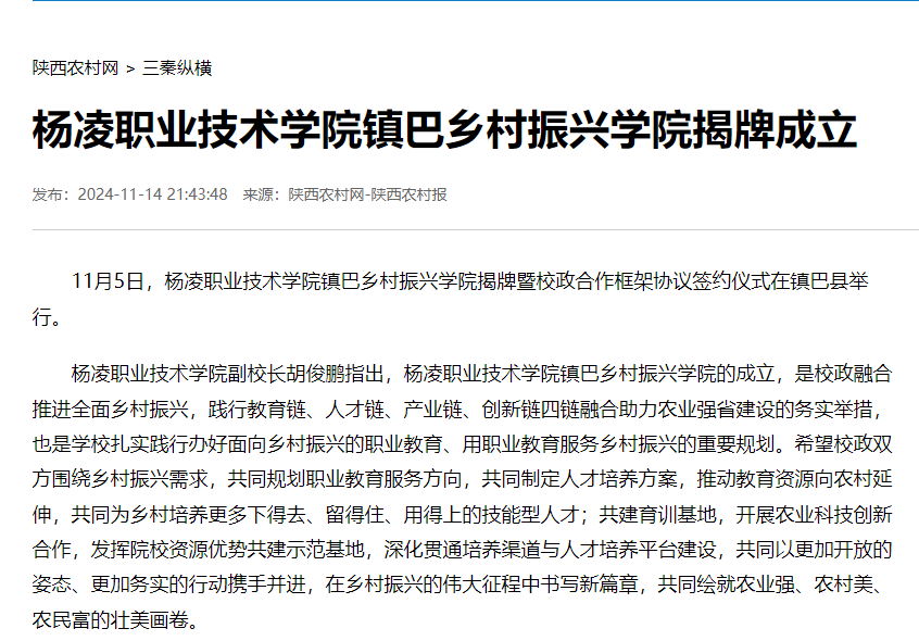 350vip浦京集团官网副校长胡俊鹏指出,350vip浦京集团官网镇巴乡村振兴学院的成立,是校政融合推进全面乡村振兴,践行教育链、人才链、产业链、创新链四链融合助力农业强省建设的务实举措,也是学校扎实践行办好面向乡村振兴的职业教育、用职业教育服务乡村振兴的重要规划。希望校政双方围绕乡村振兴需求,共同规划职业教育服务方向,共同制定人才培养方案,推动教育资源向农村延伸,共同为乡村培养更多下得去、留得住、用得上的技能型人才;共建育训基地,开展农业科技创新合作,发挥院校资源优势共建示范基地,深化贯通培养渠道与人才培养平台建设,共同以更加开放的姿态、更加务实的行动携手并进,在乡村振兴的伟大征程中书写新篇章,共同绘就农业强、农村美、农民富的壮美画卷。