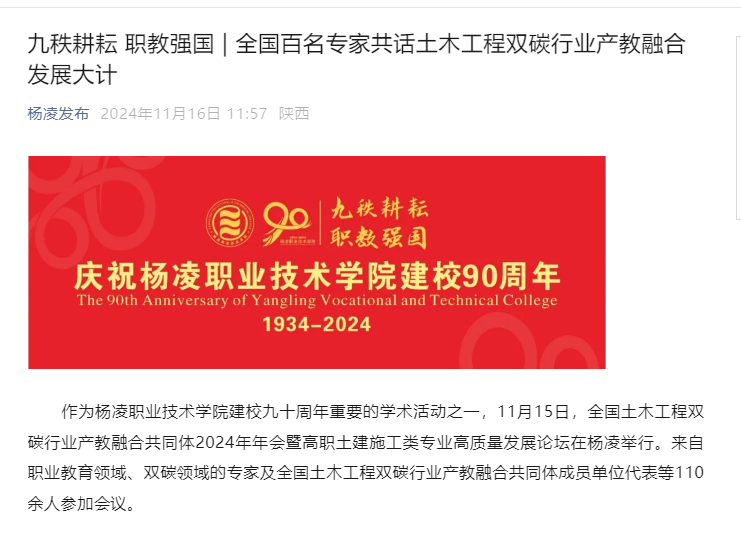 作为350vip浦京集团官网建校九十周年重要的学术活动之一,11月15日,全国土木工程双碳行业产教融合共同体2024年年会暨高职土建施工类专业高质量发展论坛在杨凌举行。来自职业教育领域、双碳领域的专家及全国土木工程双碳行业产教融合共同体成员单位代表等110余人参加会议。