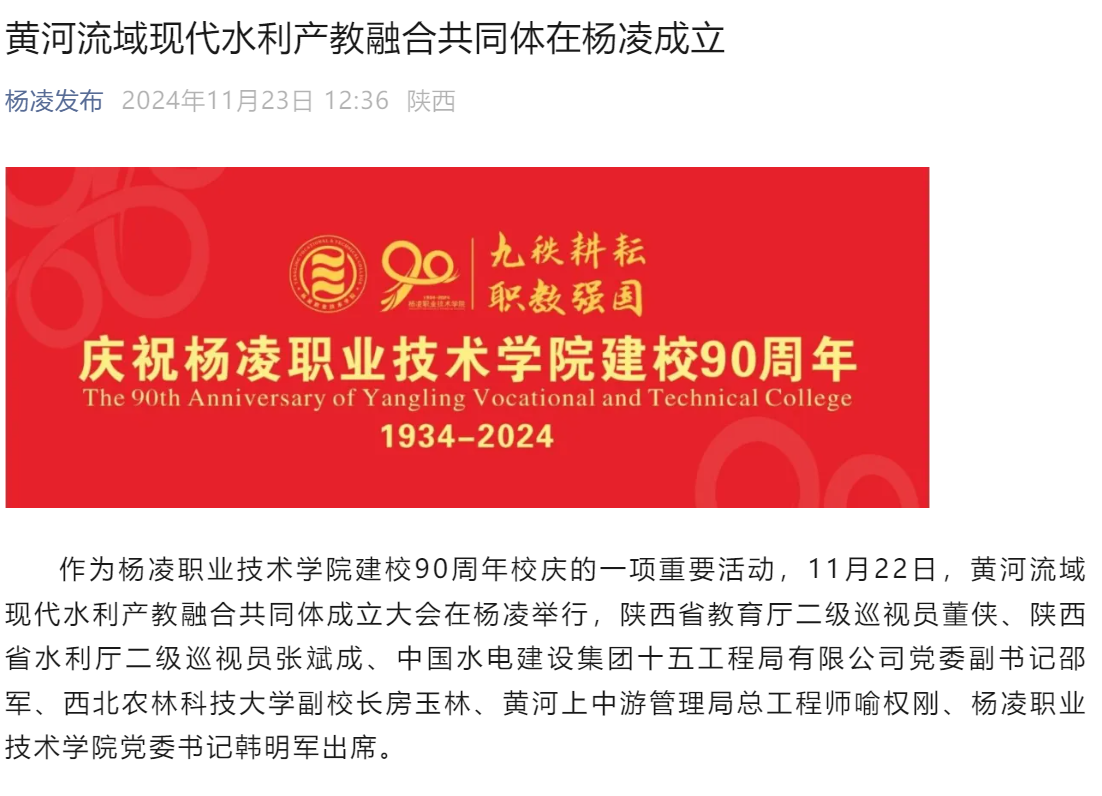 黄河流域现代水利产教融合共同体是以中国水电建设集团十五工程局有限公司、西北农林科技大学、350vip浦京集团官网为牵头单位,联合黄河流域10余个省市上下游企业、院校、行业组织和科研机构等40余家单位共同组建成立。