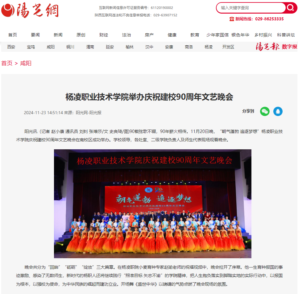 晚会共分为“回眸”“砥砺”“绽放”三大篇章。在杨凌职院小麦育种专家赵瑜老师的祝福视频中,晚会拉开了序幕。他一生育种报国的事迹激励、感染了无数师生,新时代的杨职人还将继续践行“照准目标 矢志不渝”的学院精神,把人生抱负落实到脚踏实地的实际行动中,以报国为根本,以强校为使命,为中华民族的崛起而建功立业。开场舞《盛世中华》以磅礴的气势点燃了晚会现场的氛围。