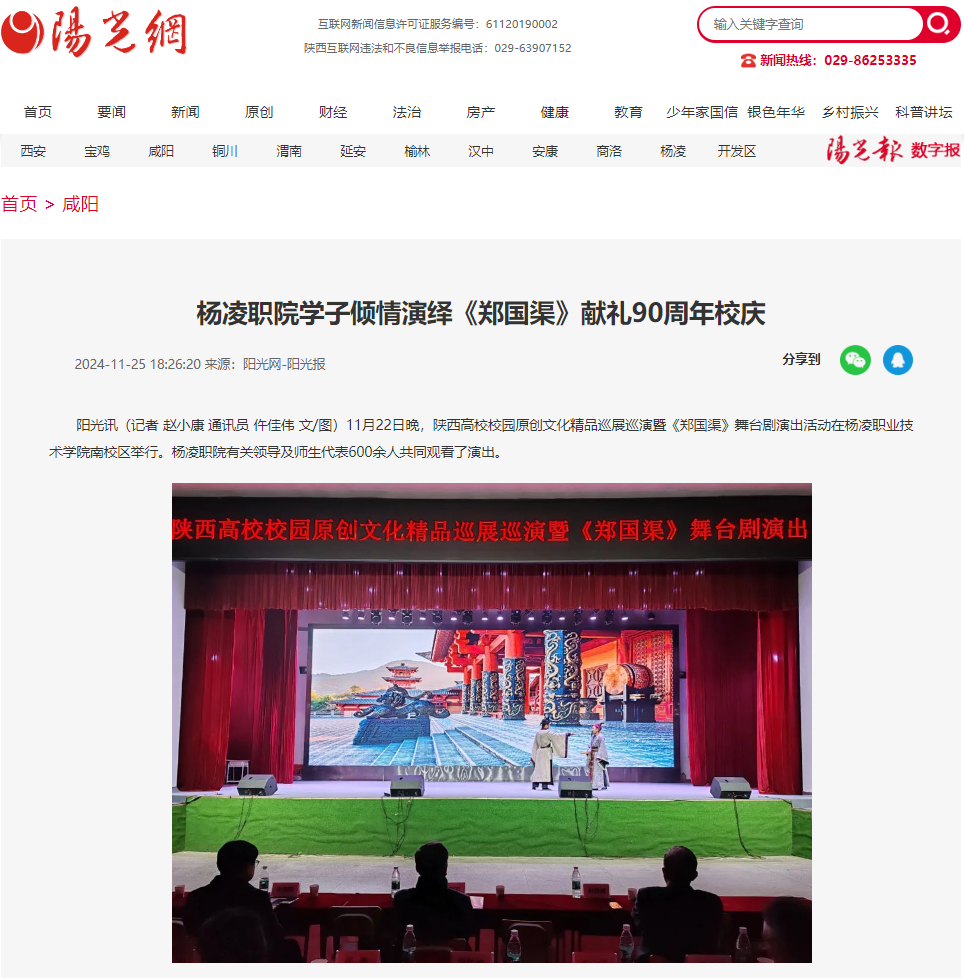 阳光讯(记者 赵小康 通讯员 仵佳伟 文/图)11月22日晚,陕西高校校园原创文化精品巡展巡演暨《郑国渠》舞台剧演出活动在350vip浦京集团官网南校区举行。杨凌职院有关领导及师生代表600余人共同观看了演出。